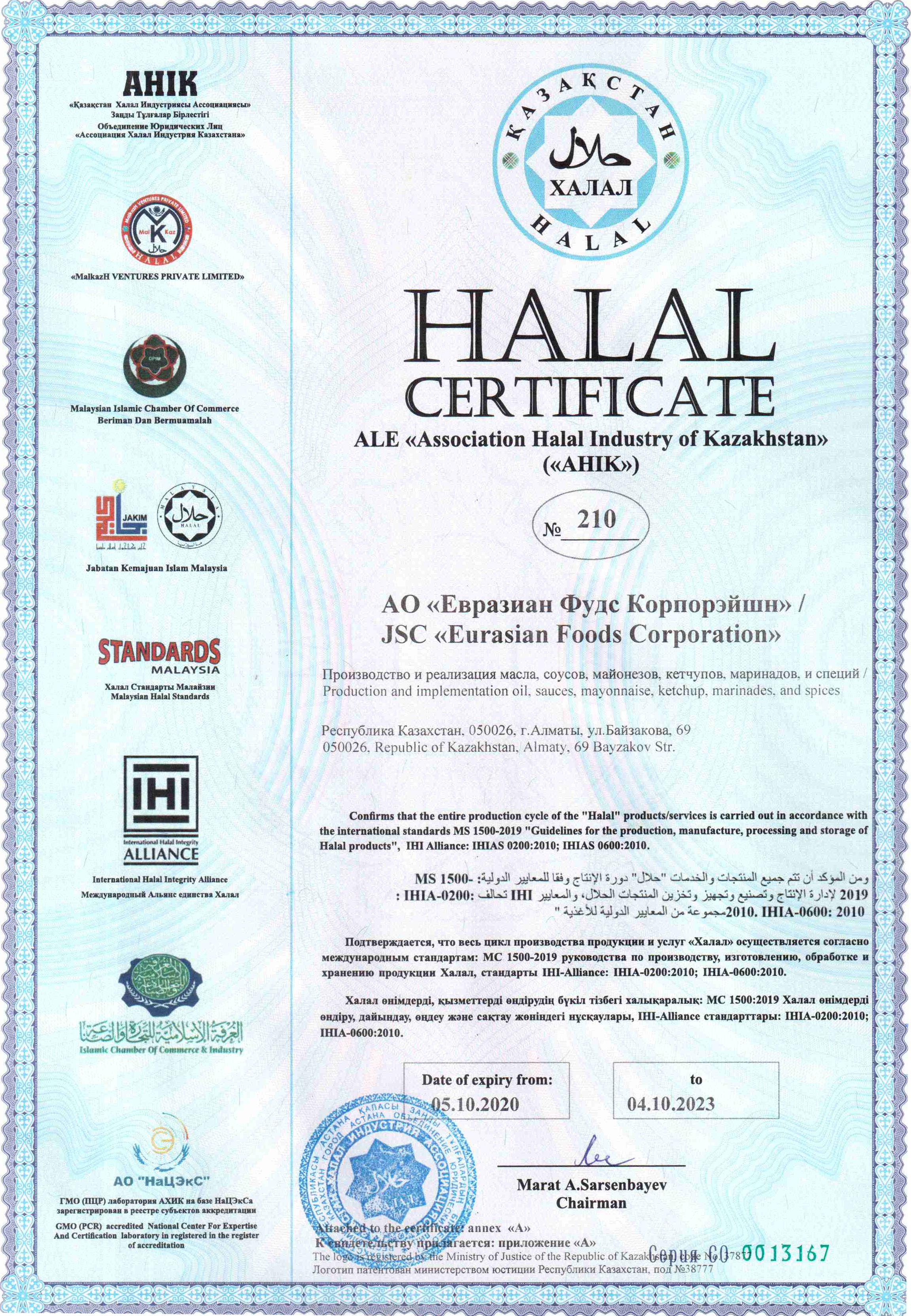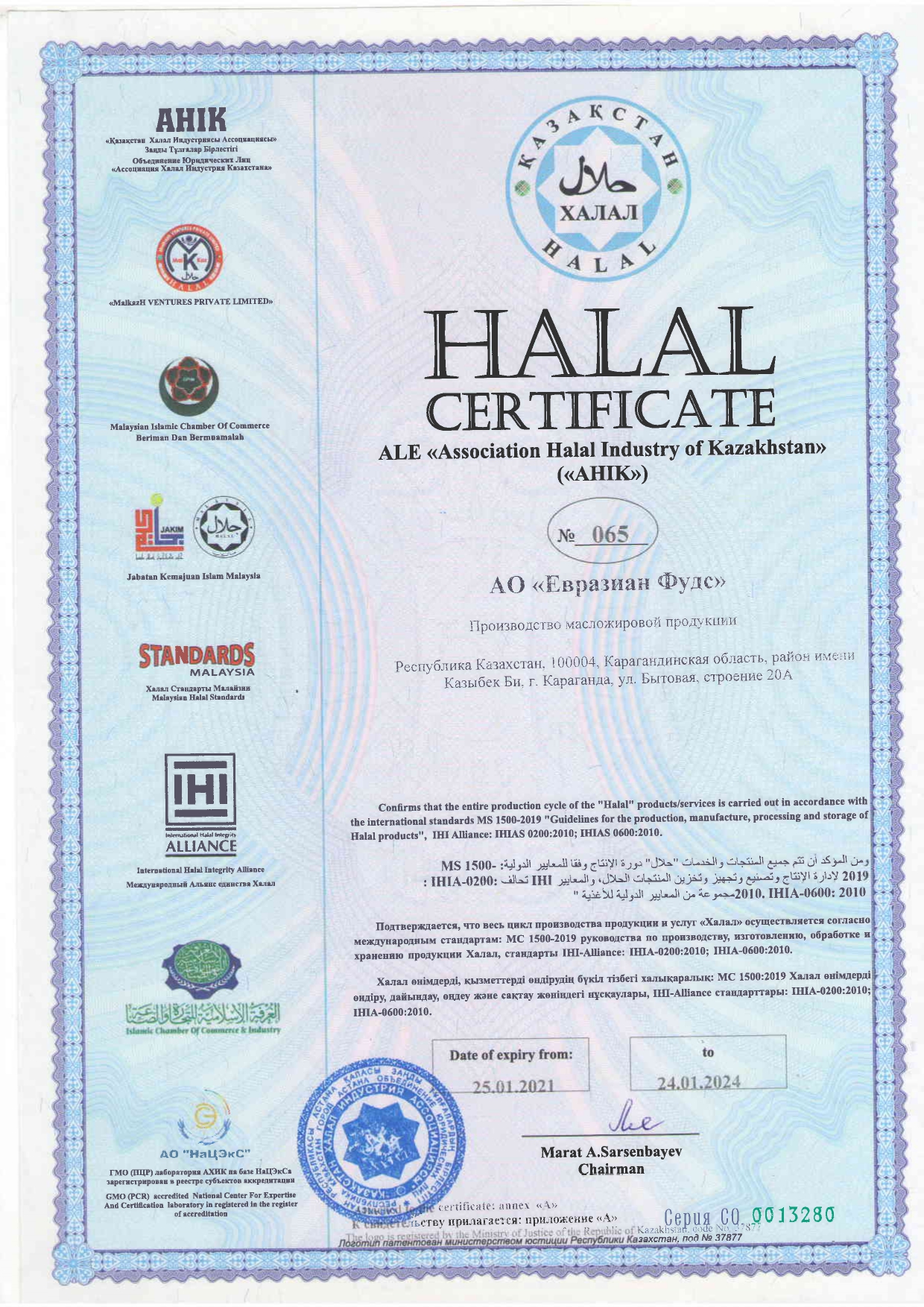 The entire range of the Company's products comply with Halal standards, which is confirmed by the corresponding certificate. It confirms that the full production cycle is carried out in accordance with international standards: MS 1500-2019 Guidelines for the production, manufacture, processing and storage of Halal products, IHI-Alliance standards: IHIA-0200:2010; IHIA-0600:2010.