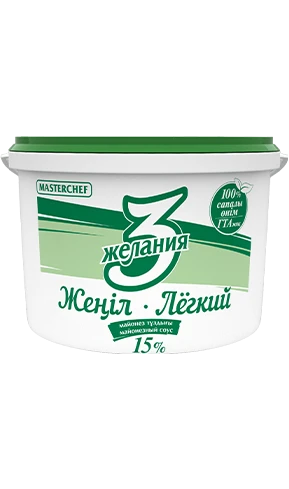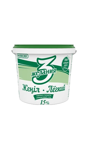 Жирность 15%. Самый низкокалорийный продукт в линейке, отличный выбор для тех, кто следит за количеством употребляемых калорий. Обладает мягкой, но в то же время достаточно густой консистенцией. Имеет сладковатый вкус с горчичной ноткой. Не содержит ГМО.