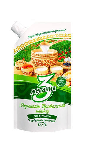 Жирность 67%. Первый в Казахстане майонез на кобыльем молоке! Создан с учетом национальных кулинарных традиций. Обладает нежным вкусом и мягкой консистенцией. Не содержит ГМО, красителей, крахмала, консервантов и ароматизаторов.