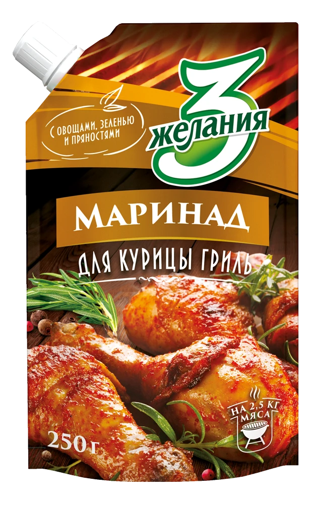 Приготовлен с добавлением кусочков овощей, зелени и пряностей. Маринад имеет нежную консистенцию, насыщенный вкус и аромат благодаря паприке, кориандру, карри, чили и чесноку. Не содержит ГМО. Маринад не предназначен для непосредственного употребления в пищу. Подходит для использования в качестве приправы для маринования курицы и полуфабрикатов с последующим приготовлением.