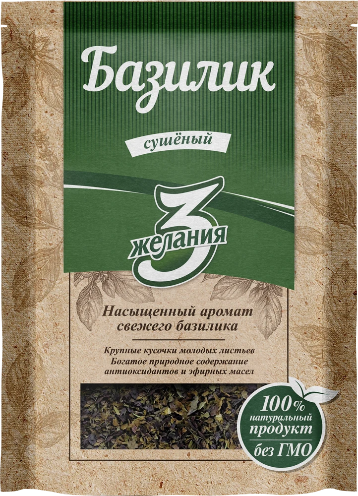Состоит из крупных кусочков молодых листьев. Обладает насыщенным ароматом свежего базилика. Отличается высоким содержанием антиоксидантов и эфирных масел. Фольгированная упаковка позволяет сохранить качество продукта. Не содержит ГМО.