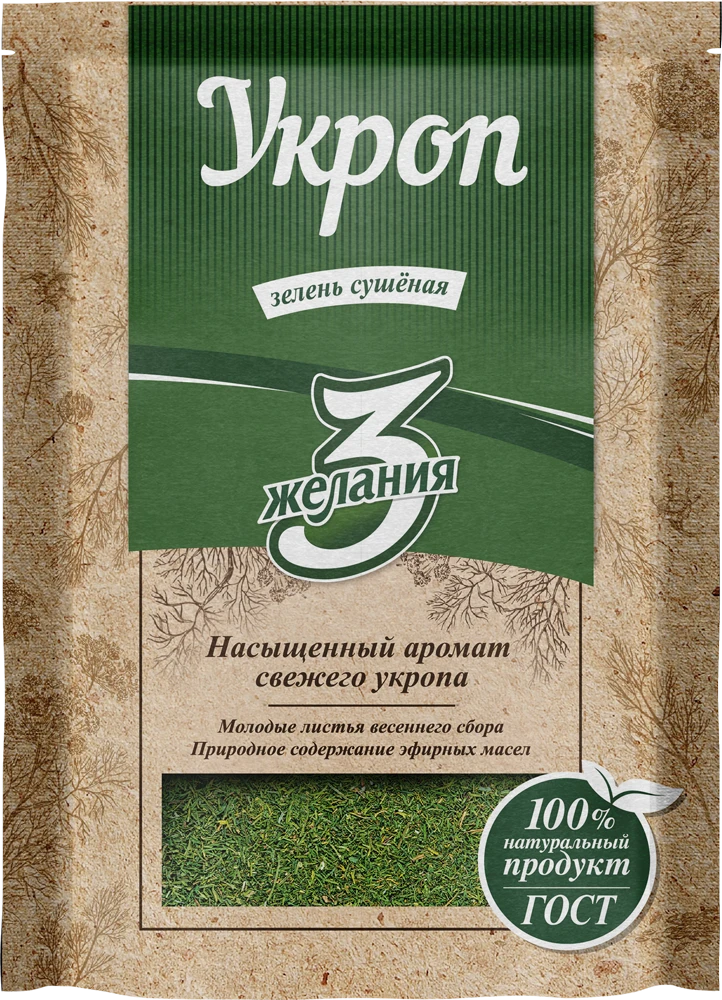 Состоит из молодых листьев весеннего сбора. Обладает насыщенным ароматом свежего укропа. Отличается высоким содержанием эфирных масел. Фольгированная упаковка позволяет сохранить качество продукта. Не содержит ГМО.